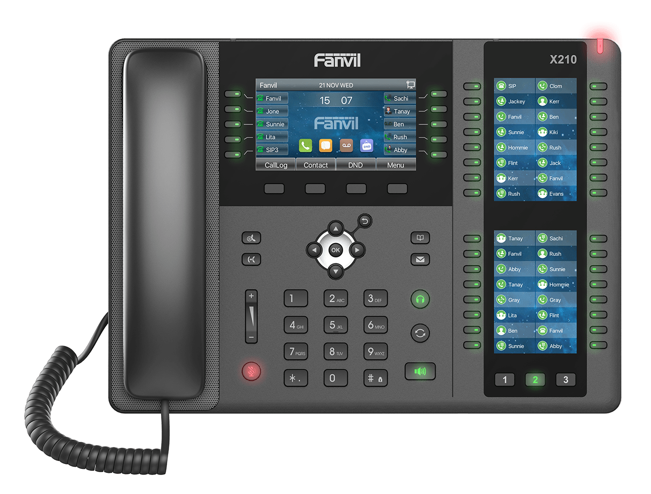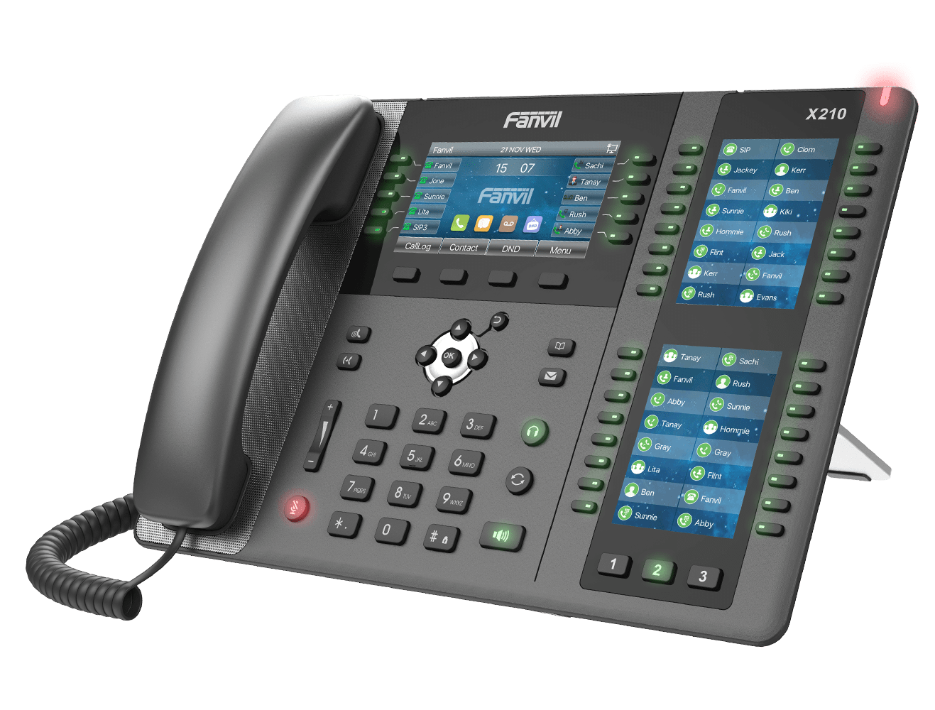 The X210 features a 4.3 inch main color screen and two integrated 3.5 inch side displays for dynamic keys assignments and real time monitoring of extensions. BLF , and call functions , Equipped wiwth HD audio powered by dual giga bit ports , PoE , built in bluetooth , Wifi compaitaibility and EHS headset support, it is complete communication hib for business use.